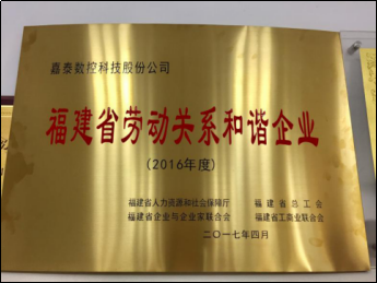 | 嘉泰数控:被授予“福建省劳动关系和谐企业”荣誉称号 |
