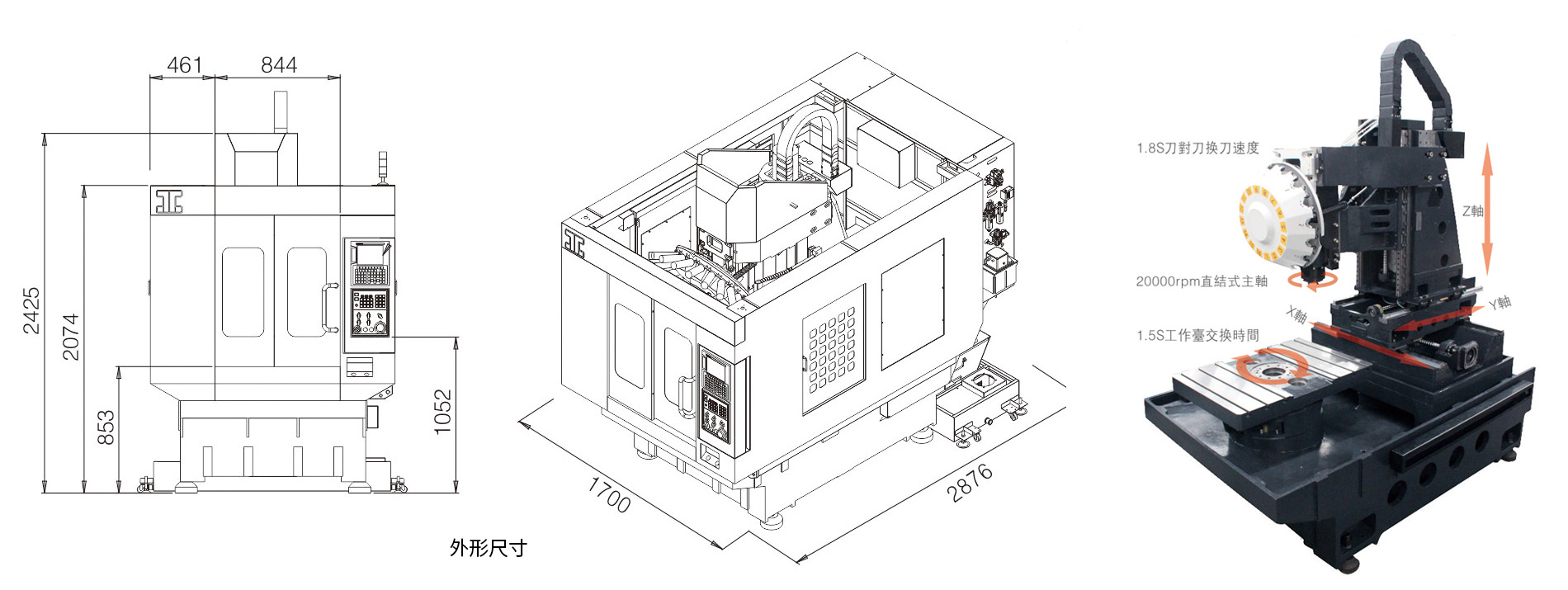 1、回转工作台装置:采用最新直驱式电机传动机构,传动速度快,最高可实现 1.5S 工作台交换动作;