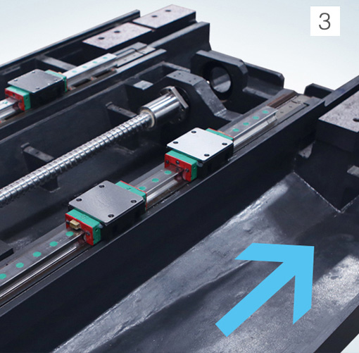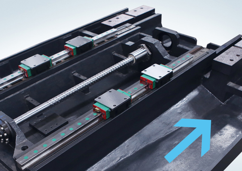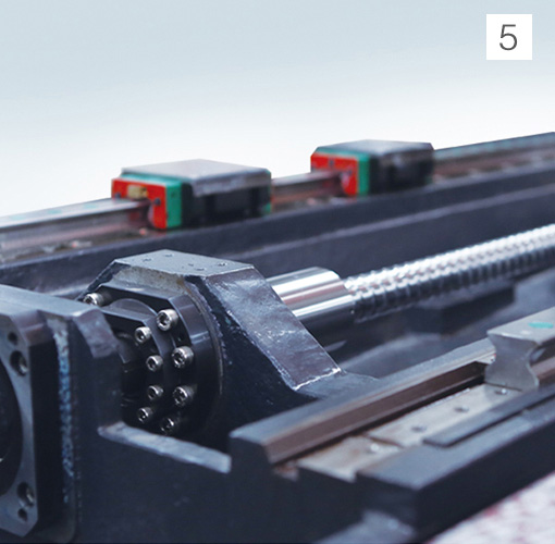 3、传动部件:三轴皆使用精密级丝杆,并予以适当的预压,尾端采预拉设计,配合高精密级低阻力线轨,确保高速、高精度加工要求。